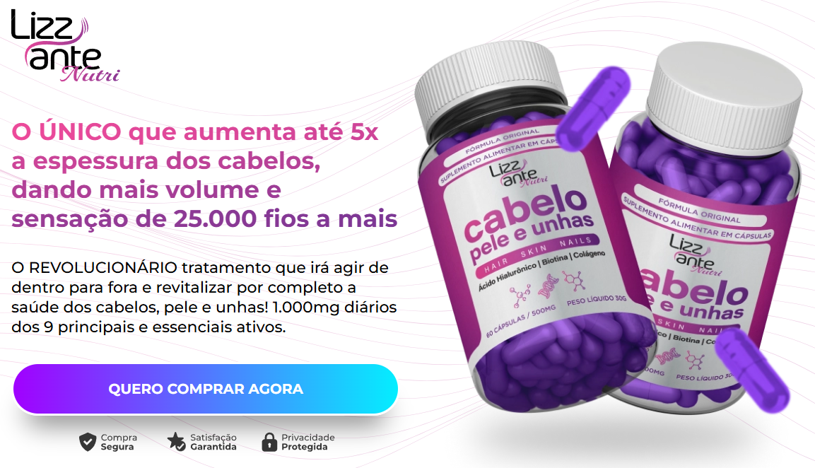 A Vitamina da Lizz ante Nutri para Cabelos, Pele e Unhas é um revolucionário tratamento que contém uma formulação original e exclusiva! Em sua formulação contém 9 ativos concentrados que agem diretamente na saúde completa dos cabelos, pele e unhas! Nos cabelos é possível notar um aumento de até 5x na espessura dos fios dando uma sensação de até 25.000 fios a mais, na pele irá diminuir as rugas e linhas de expressão e nas unhas irá aumentar a espessura até 2x mais, fortalecendo e proporcionando um crescimento acelerado.