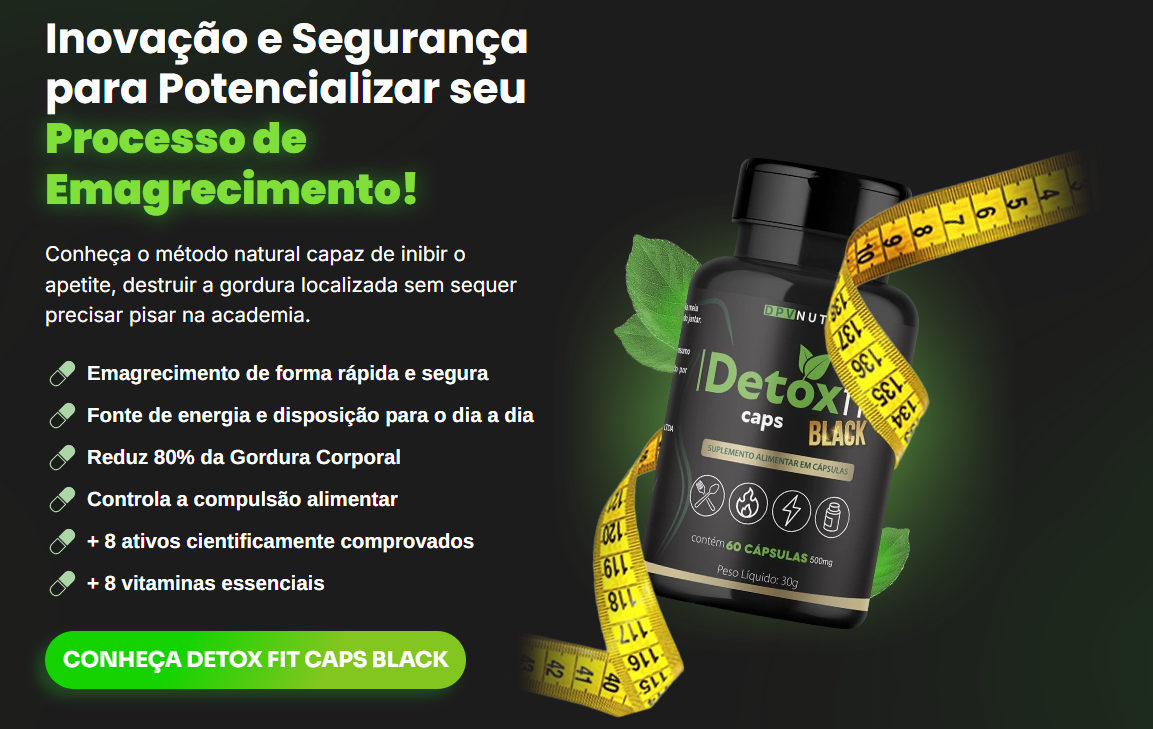 Detox Fit Caps Black tem formato de cápsulas com ingredientes 100% naturais, para te ajudar a controlar o apetite, eliminar os quilinhos a mais, ficar mais leve e desintoxicar de forma segura e eficaz logo nos primeiros dias de uso.